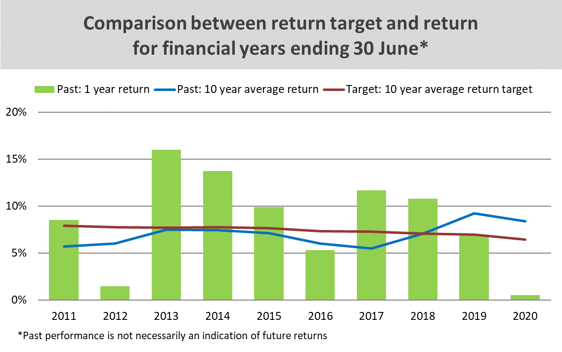 | 10-year average return of 8.37% per year as at 30 June 2020 | The return target for 2021-2030 is 3.10% per year above inflation, after fees and taxes. Future returns cannot be guaranteed. |